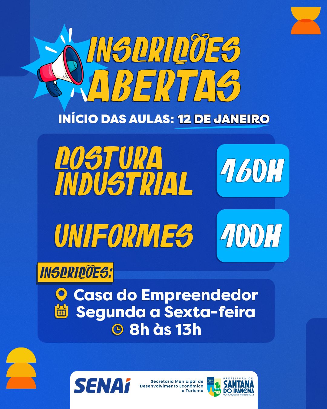 A Prefeitura de Santana do Ipanema, por meio da Secretaria Municipal de Desenvolvimento Econômico e Turismo, em parceria com o Serviço Nacional de Aprendizagem Industrial (SENAI), oferece dois importantes cursos de qualificação profissional na área da costura. As aulas terão início no dia 12 de janeiro. Estão sendo ofertados os cursos de Costura Industrial, com carga horária de 160 horas, e Uniformes, com 100 horas, ambos voltados para quem deseja ingressar ou se aperfeiçoar no setor de confecção. O curso de Costura Industrial prepara os alunos para o ambiente de produção profissional, abordando o domínio sobre máquinas de costura industrial, acessórios, equipamentos, org...